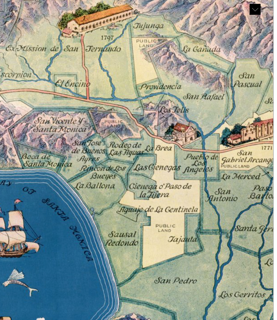 Some time ago I decided to dig into rancho history. I knew the basics because I grew up in California and all children learn about ranchos in the fourth grade. But my knowledge was limited, I remembered there were two eras of ranchos : Spanish Ranchos (1784-1821) and Mexican Ranchos (1821-1846). I knew the rancho eras went hand in hand with the Mission Era which was hell bent on making everyone Christian which bugged me even as a kid. I certainly knew none of these eras were good for the Native Americans. But driving down streets like San Vicente with its weird angle always made me think, “I bet it is on an angle for a reason.” Or wondering, “Why do all the streets bend at Hoover? Or when I was working at KCET one day and saw a plaque honoring west corner of the original pueblo and I thought, “From Olvera Street in downtown?” I knew in some dusty parts of my bones that all of these things had to do with those Spanish and Mexican Eras.