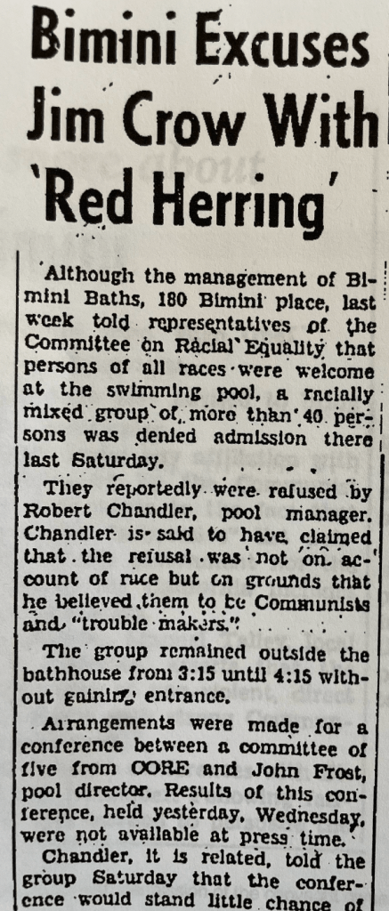 Bimini Baths was not open to everyone. Non white people were banned from the pools. A Latino neighbor recalled years later, that he and his friends were relegated to the last day before the water was changed as it was “too dirty for white patrons”. In the mid 40s, African Americans fighting for equity, filed lawsuits and protested the white only policy. In one article it was reported that the pool manager refused entry to the group because he believed them to be “Communists and trouble makers.” In 1948 Bimini Bath lost a final lawsuit forcing them to desegregate the pools. No elected official rallied to keep Bimini hot mineral pools open and desegregated. Not one. Instead Bimini Baths declared bankruptcy (1951). Imagine if the city had purchased the property and left the marsh lands open and turned the surroundings into a park highlighted by the natural waters of Bimini Baths. This would have been a treasured asset in the community and city. Instead, civic leaders lacked vision, courage and creativity to be on the right side of history in 1948. Let’s put a pin in that note.