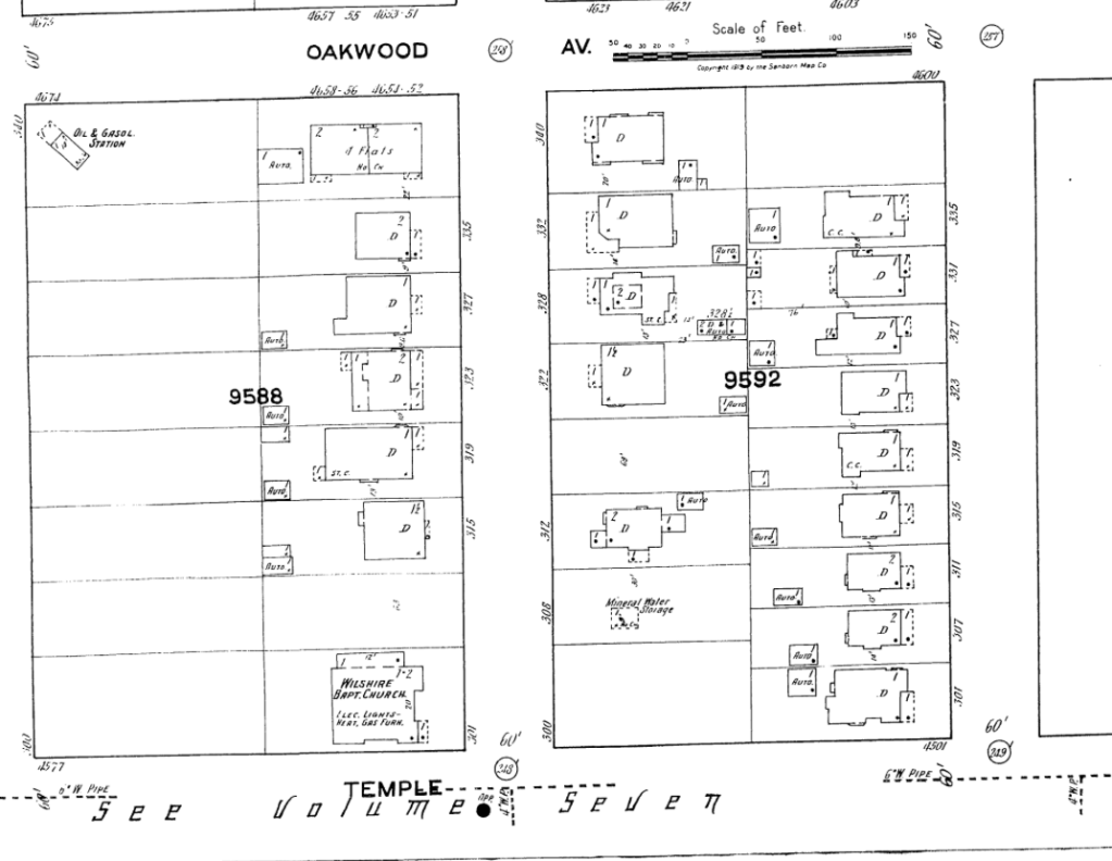 Around 1900, one mile west of Bimini (near Western) and also off Beverly, in a wheat field, another wildcatter drilled and he also hit hot water. The pipe was capped, the speculator moved on until 1909, W Herbert Allen, developer of the Allandale housing tract, sold two Oxford street lots to Richard Grant. Grant took one lot for his home and as explained by his grandson in a 1972 interview in the LA Times, he offered up the hot water for free to his neighbors until the city’s piped water arrived in 1915. It is quite extraordinary, given all the developers who marched through Los Angeles, that this lot remained empty for eight decades with only the ‘mineral water storage’ shed (as identified by Sanborn Insurance)on the land.