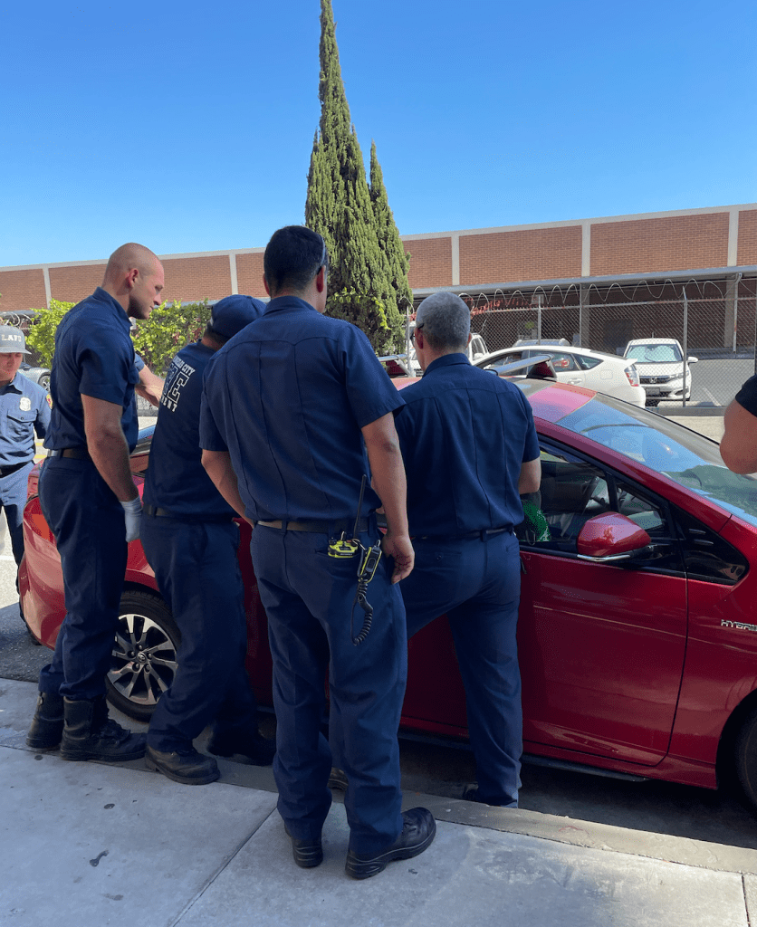 The EMS team tried all the doors. They were locked. I asked, “Do you have a Slim Jim?” The guy closest to me said, “It’s in the engine.”